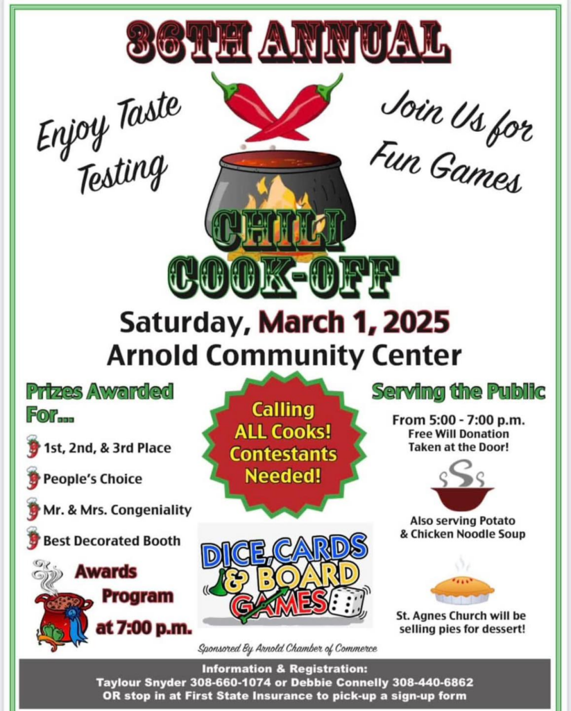Arnold invites everyone to their 36th annual Chili Cook-off this Saturday, March 1st at the Arnold Community Center.
