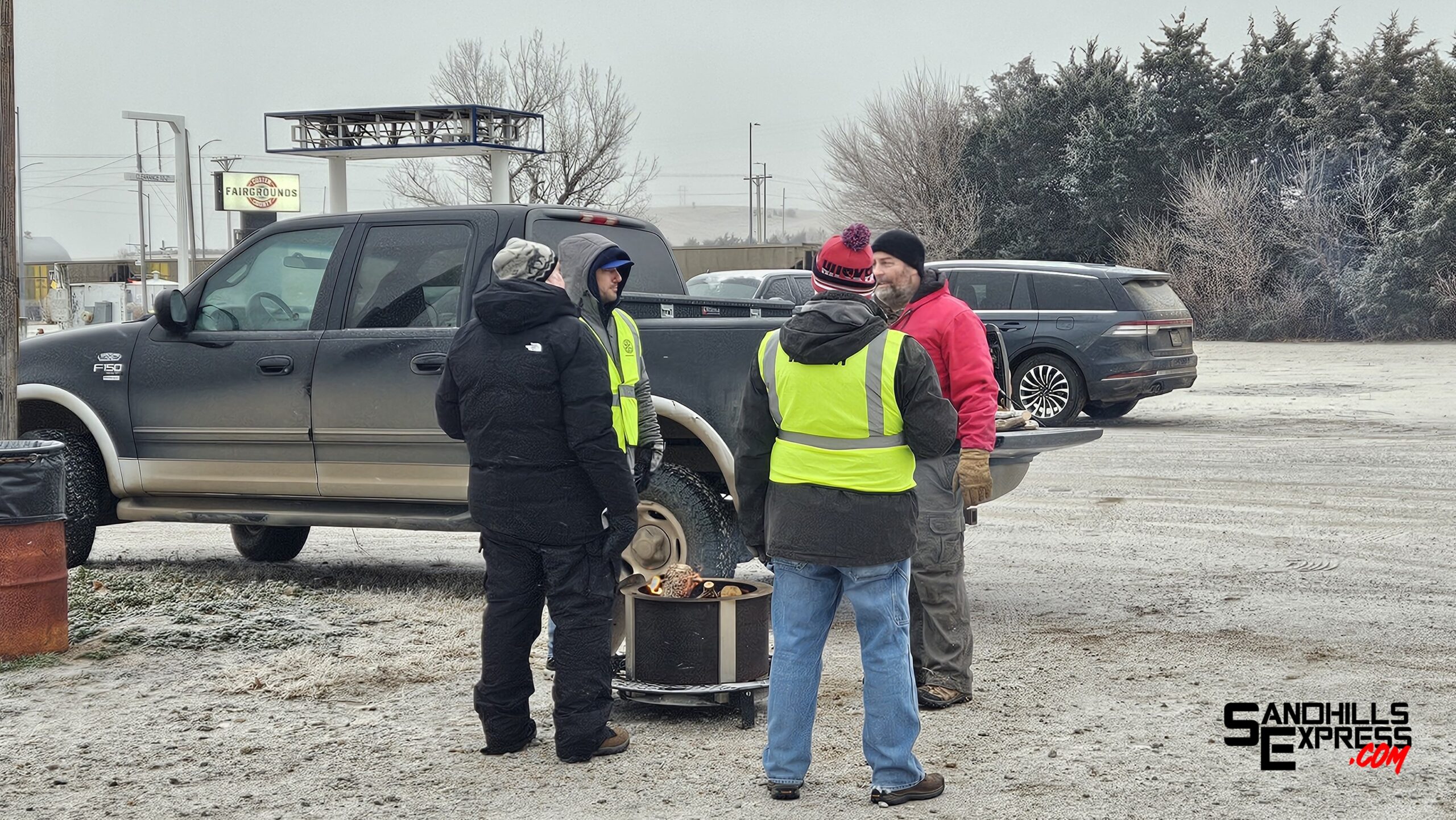 Volunteers keep warm around a fire at the Children’s Christmas Fund pickup site.