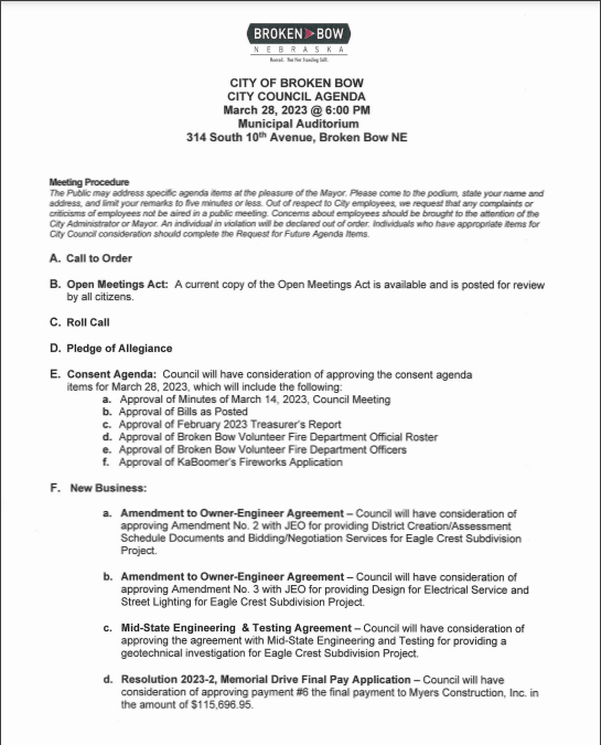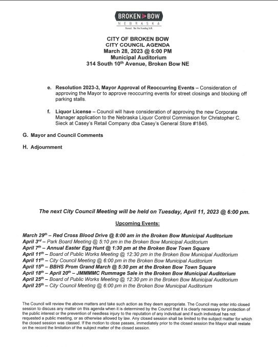 Finally, the council will consider approving a new liquor license for Casey’s General Store in Broken Bow. A full agenda is attached; as always, the meetings are open to the public.