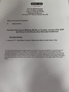 BROKEN BOW – The Broken Bow City Council will hold its first 2024 meeting on January 9 at 6:00 p.m. in the Municipal Building.