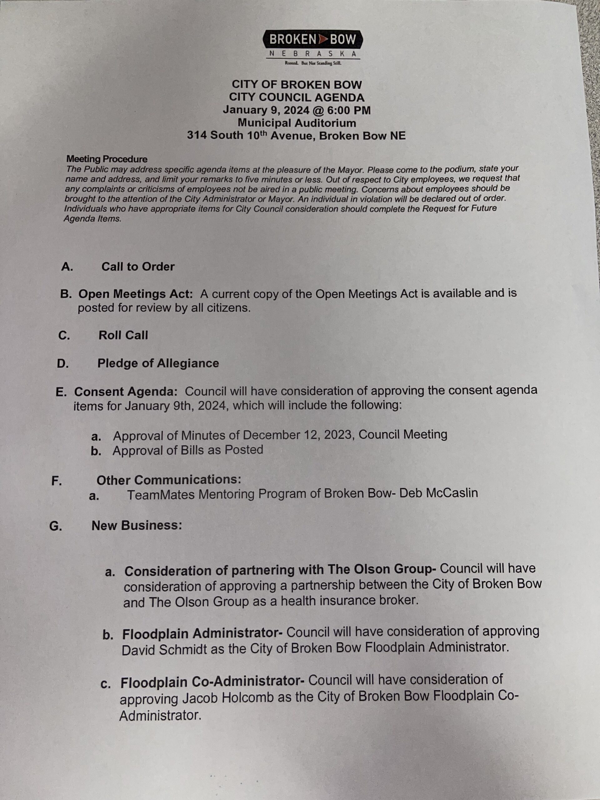 Under new business, the Council will consider partnering with The Olson Group as the City of Broken Bow’s health insurance broker, consider approving City Administrator, David Schmidt as the City of Broken Bow Floodplain Administrator, and consider Deputy Clerk, Jacob Holcomb as Floodplain Co-Administrator.