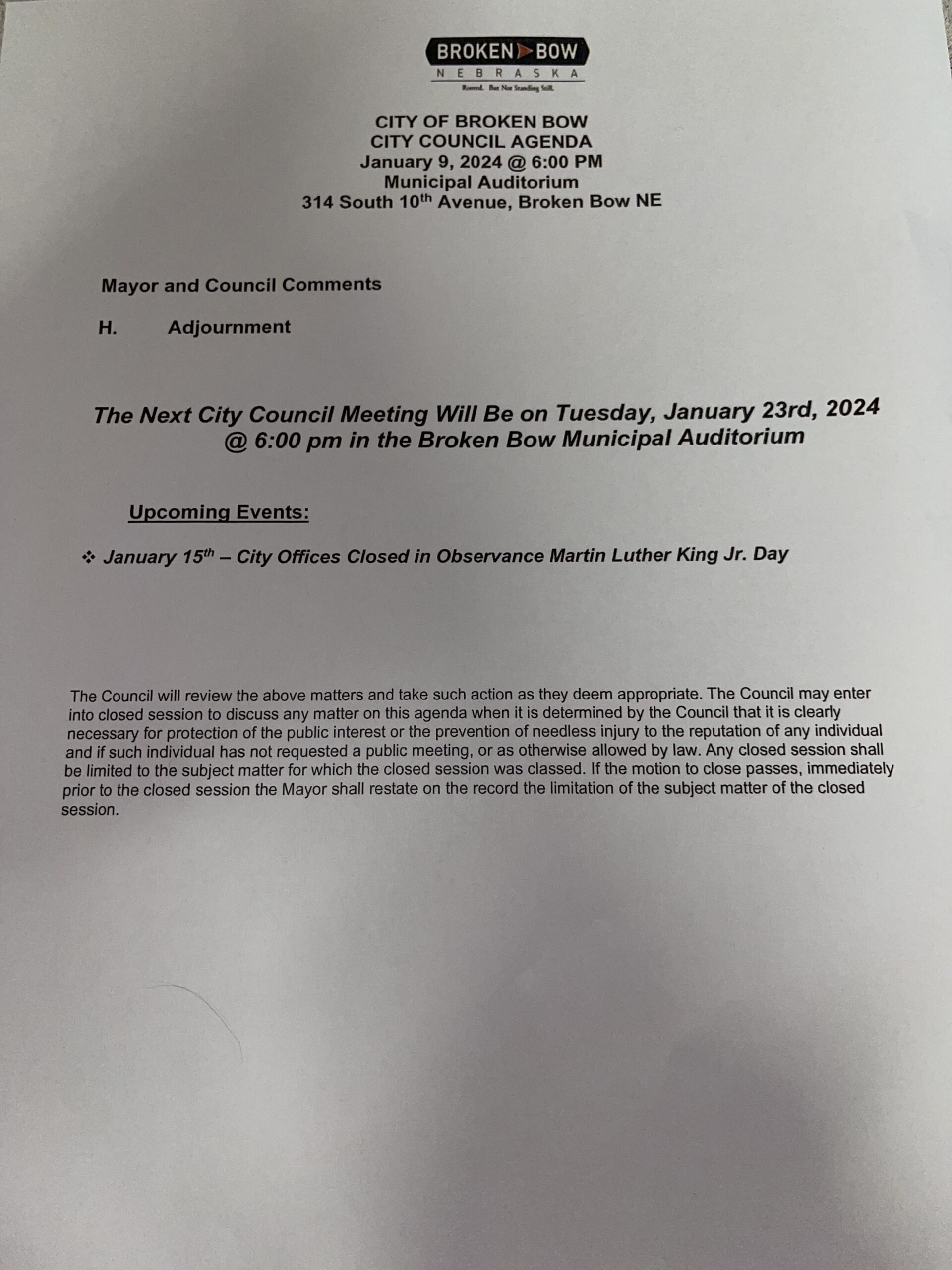 BROKEN BOW – The Broken Bow City Council will hold its first 2024 meeting on January 9 at 6:00 p.m. in the Municipal Building.