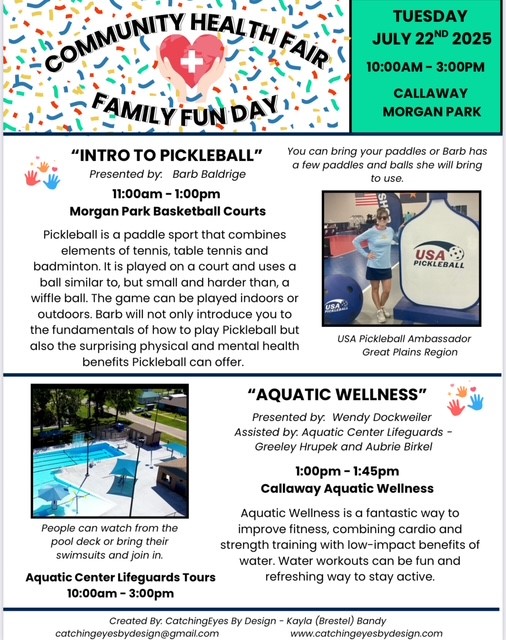 - Aquatic Wellness, led by Wendy Dockweiler and assisted by local lifeguards Greeley Hrupek and Aubrie Birkel, will run from 1:00 to 1:45 p.m. at Callaway Aquatic Wellness. This session focuses on low-impact fitness through cardio and strength routines in the water. Pool tours will also be available from 10:00 a.m. to 3:00 p.m.
