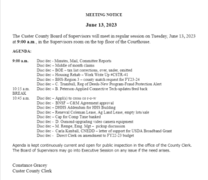 BROKEN BOW – The Custer County Board of Supervisors is scheduled to meet on Tuesday, June 13 on the top floor of the Custer County Courthouse at 9 a.m.