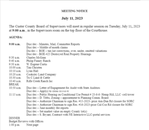 BROKEN BOW – The Custer County Board of Supervisors will hold its first July meeting on the top floor of the Custer County Courthouse on Tuesday, July 11 at 9 a.m.