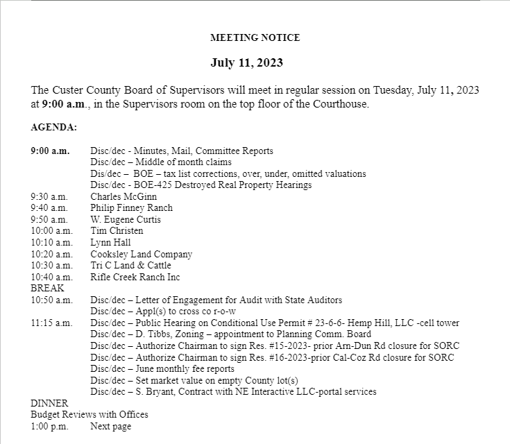 BROKEN BOW – The Custer County Board of Supervisors will hold its first July meeting on the top floor of the Custer County Courthouse on Tuesday, July 11 at 9 a.m.
