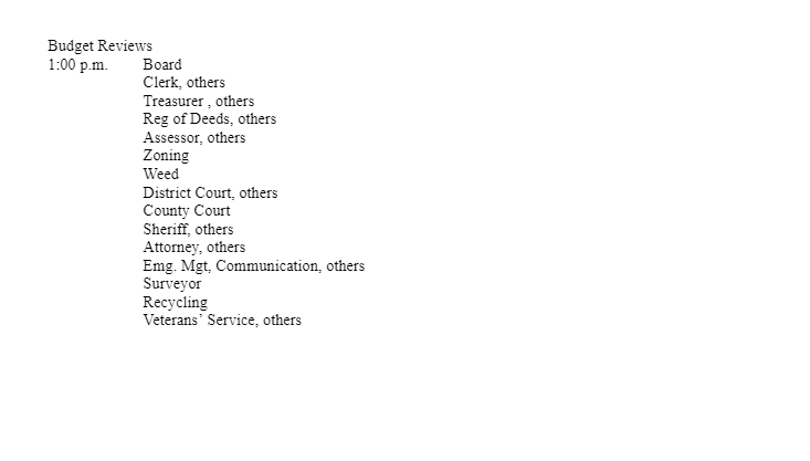 The board will also discuss the monthly fee reports for June and set the value on empty county lots which the supervisors have considered selling for a month. After a break, the board will then hold budget reviews with about 15 county offices. As always, the meeting is open to the public; a full agenda is attached.