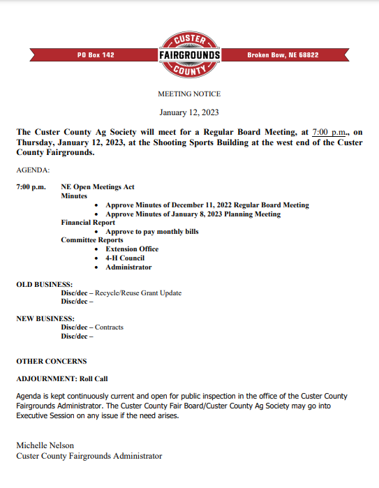 BROKEN BOW – The Custer County Ag Society will meet for its regular board meeting at 7 p.m. on Thursday, January 12 at the Shooting Sports Building on the Custer County Fairgrounds.