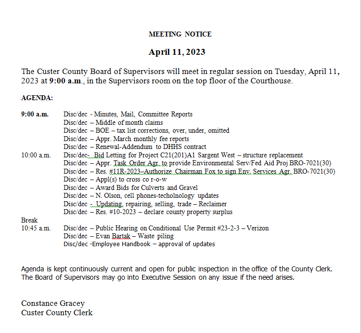 BROKEN BOW – The Custer County Board of Supervisors will hold its first April meeting tomorrow at 9 a.m. on the top floor of the Custer County Courthouse.