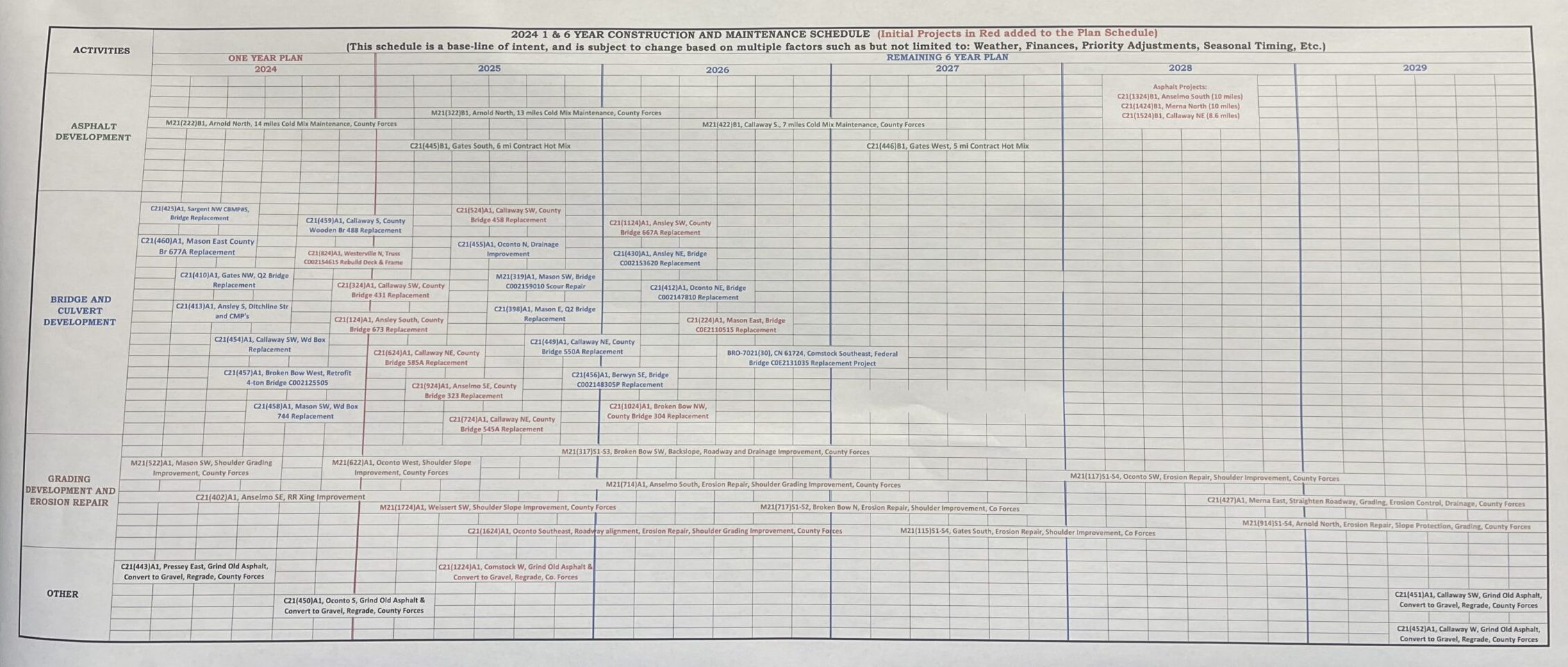 The one and six-year plan includes asphalt development, bride and culvert development, grading development, erosion repair, and others which include converting roads to gravel.