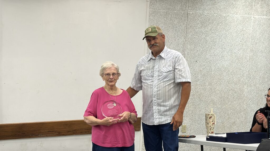 The meeting started with recognizing LaVonne McGraw. Mark and Kelly Cardoza presented McGraw with a plaque celebrating 35 years of volunteer service with open class fair entries.