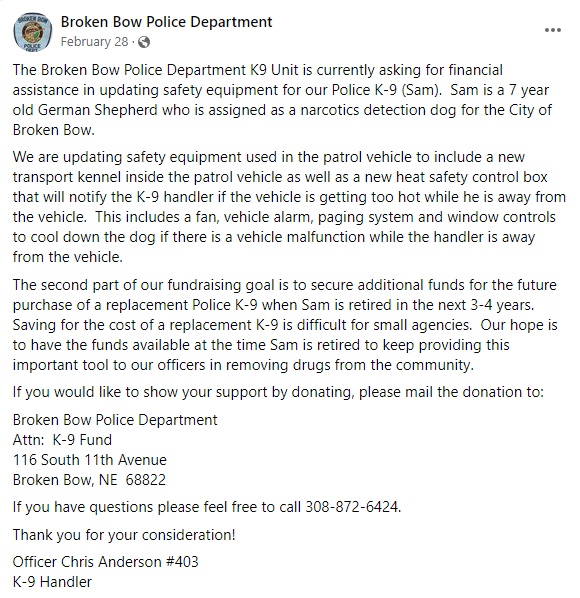 “We noticed the article about the Broken Bow Police dog needing updated safety equipment and as 4H club, we decided to do a community service project and do a fundraiser to raise money to donate our proceeds to help get that updated equipment,” Burnett said.