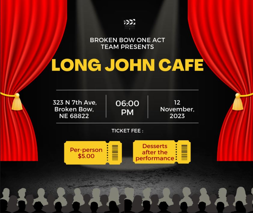 The Broken Bow One Act will be hosting a performance of their play “Long John Cafe” on Sunday at 6:00 p.m. in the Middle School Auditorium.