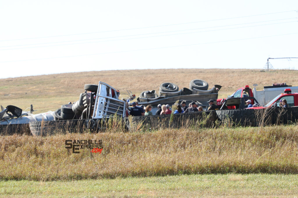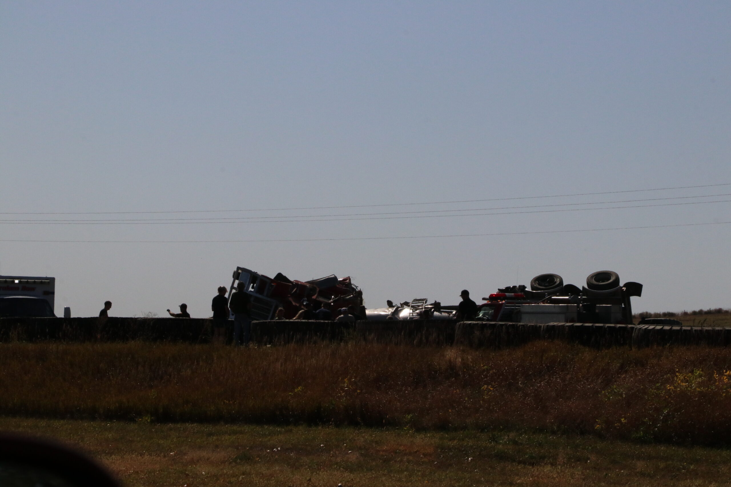 According to the Custer County Sheriff’s Office, deputies arriving on scene observed a silver semi with disabling damages in the middle of the intersection as well as a semi and tanker trailer tipped onto its driver side in a north ditch.