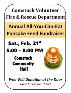 Breakfast for dinner starts Saturday evening, February 21, when the Comstock Volunteer Fire and Rescue Department hosts their Annual All-You-Can-Eat Pancake Feed Fundraiser. A free will donation will be accepted at the door of the Comstock Community Hall. Pancakes will be served from 5:00 PM to 8:00 PM in support of Comstock Fire and Rescue.