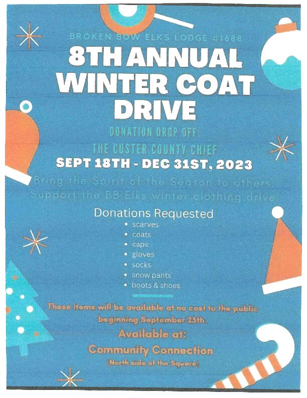 You are invited to drop off hoodies, scarves, coats, caps, gloves, socks, snow pants, and boots/shoes at the Custer County Chief, any time between now and December 31.