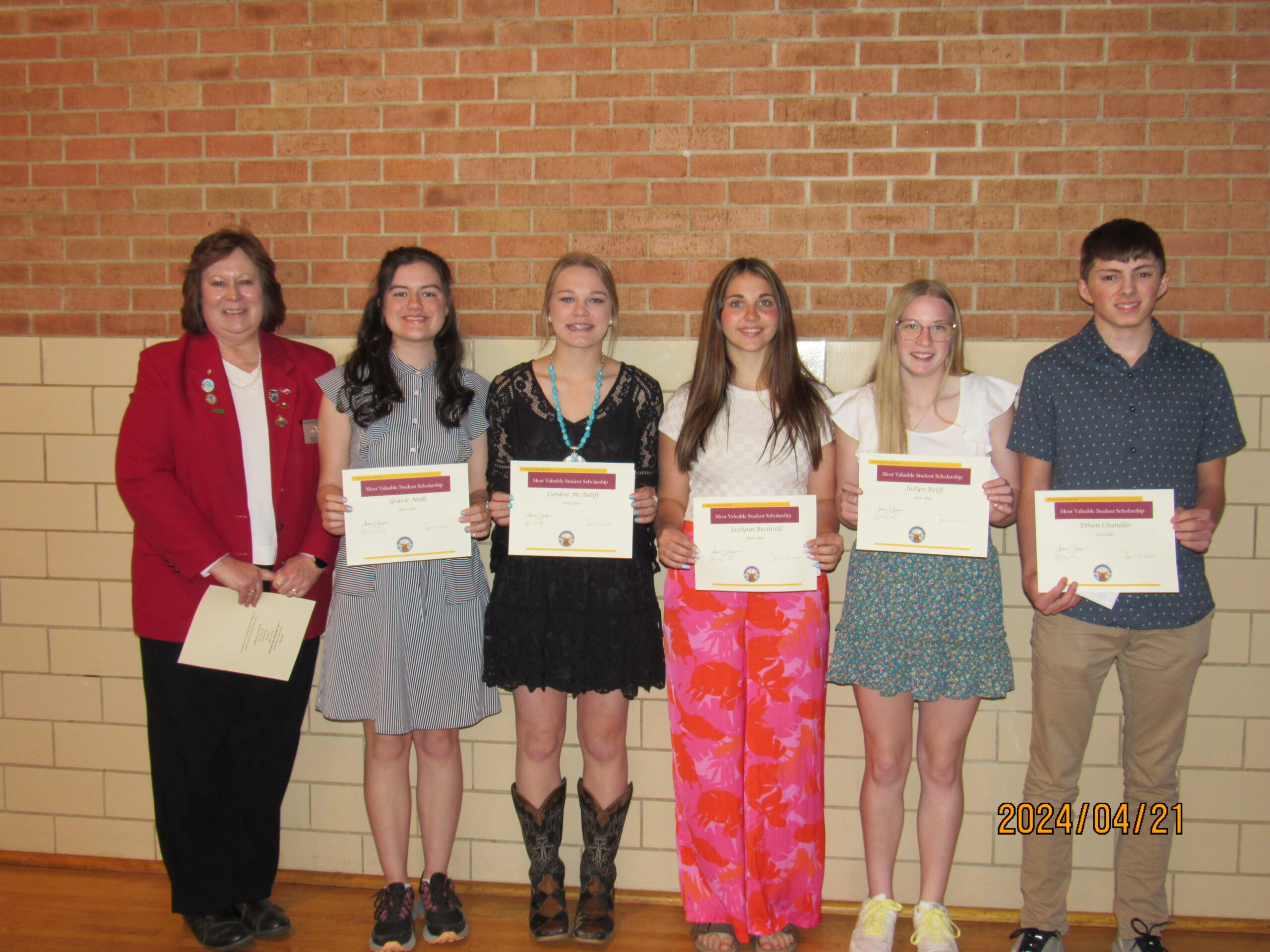 Most valuable students were Gracie Neth from Arnold, Lyndsie McAuliff from Litchfield, Jazlynn Bechtold from Callaway, Joslyn Reiff from Callaway, and Ethan Chandler from Anselmo-Merna. Not present were Rio Remund from Arnold and Delaney Rogers from Arnold.