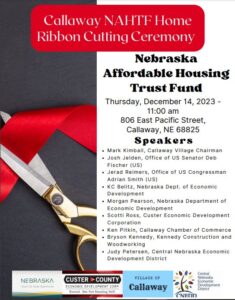 Callaway received a $500,000 grant from the Nebraska Affordable Housing Trust Fund to construct three single-family homes for income-qualified individuals and families. Two of the homes have already been built and sold in Broken Bow and the last will be built in Callaway.