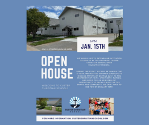 Enrollments for the Custer Christian School will begin in mid-January and will happen after the open house on January 15, 2024 at 6:00 p.m.