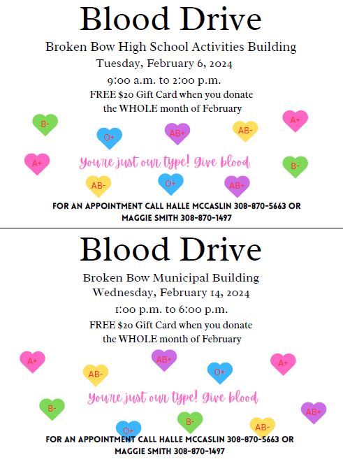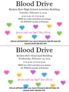 The first blood drive will be on February 6 from (;00 a.m. – 2:00 p.m. at the Broken Bow High School Activities Building, and the second will be on February 14 from 1:00 p.m. – 6:00 p.m.