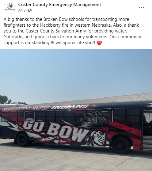 “A big thanks to the Broken Bow schools for transporting more firefighters to the Hackberry fire in western Nebraska. Also, a thank you to the Custer County Salvation Army for providing water, Gatorade, and granola bars to our many volunteers. Our community support is outstanding & we appreciate you!! ❤️”