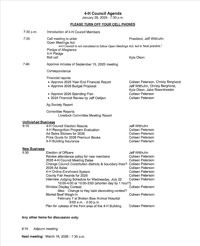 The 4-H Council Business Meeting is open to the public. A copy of the full agenda as provided to KCNI/KBBN is found below.