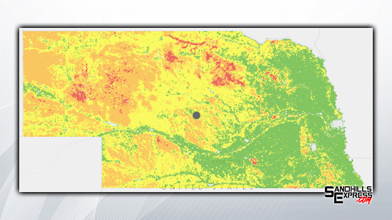 The Nebraska Wildfire Risk Explorer from the Nebraska Forest Service is painted with colors across the state ranging from green (indicating a low risk) to bright red (indicating a very high risk). The most prominent colors seen in central Nebraska and to the north and west are “moderate” risk yellow, “high” risk orange, and “very high” risk red.