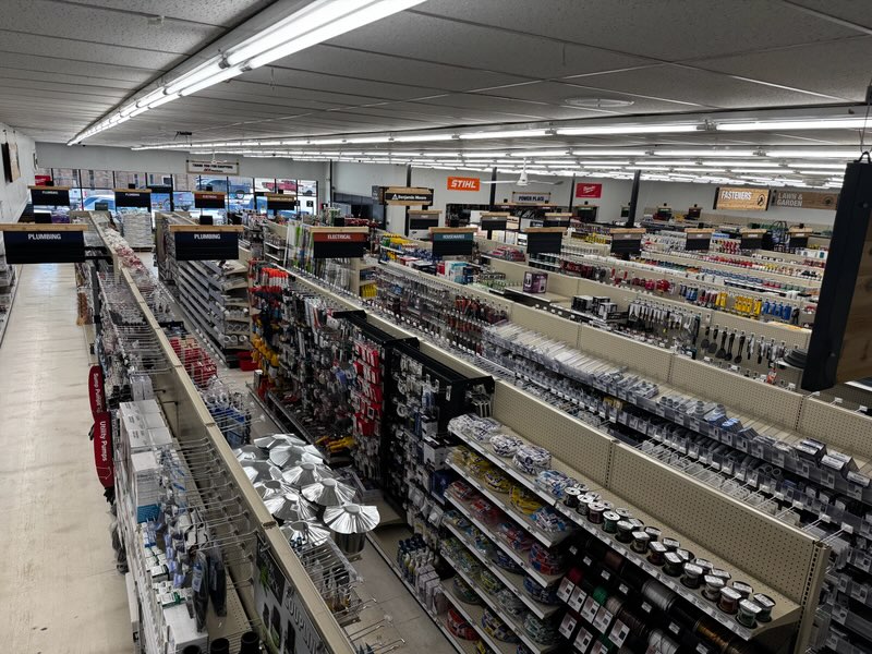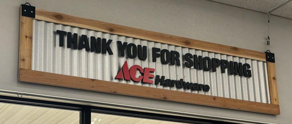 The chalkboard hour sign out front shows hours of Monday to Friday 7:30 am to 7:00 pm, Saturday 8:00 am to 6:00 pm, and Sundays from 10:00 am to 5:00 pm. Those who visit will see the Ace team continuing to fill shelves and rearrange items. A grand opening is in the near future.