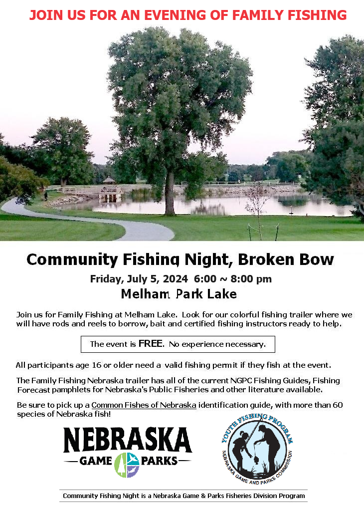 Those attending Friday evening are asked to look for the colorful Family Fishing Nebraska trailer. Inside are rods and reels to borrow, bait, and information including Nebraska Game and Parks fishing guides, fishing forecast pamphlets for Nebraska’s public fisheries, and other literature. Certified fishing instructors will also be on hand to help.