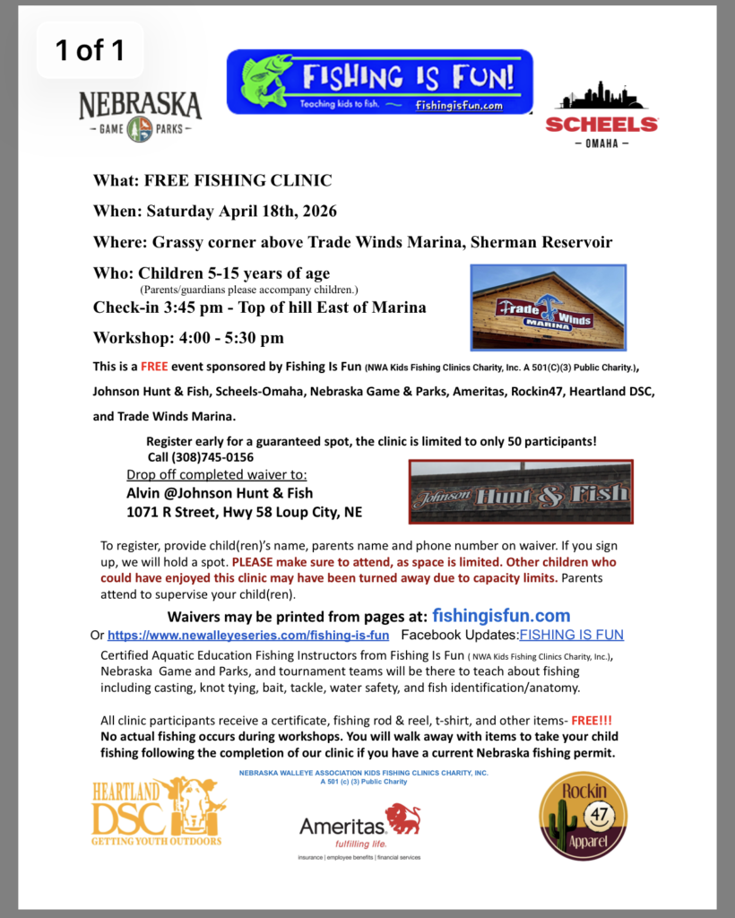 Since the event is limited to 50 kids, organizers are stressing the importance of registering in advance by completing a waiver, available at FishingIsFun.com (you can also download it at the link below). Completed waivers can be dropped off at Johnson Hunt & Fish in Loup City.