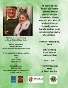 BROKEN BOW – Small communities are wonderful at coming together to support another person or a family in their time of need. At the Vet’s Building on February 25 from 11-2:00 will be a free will donation meal and silent auction for Donna Hilkemeier.