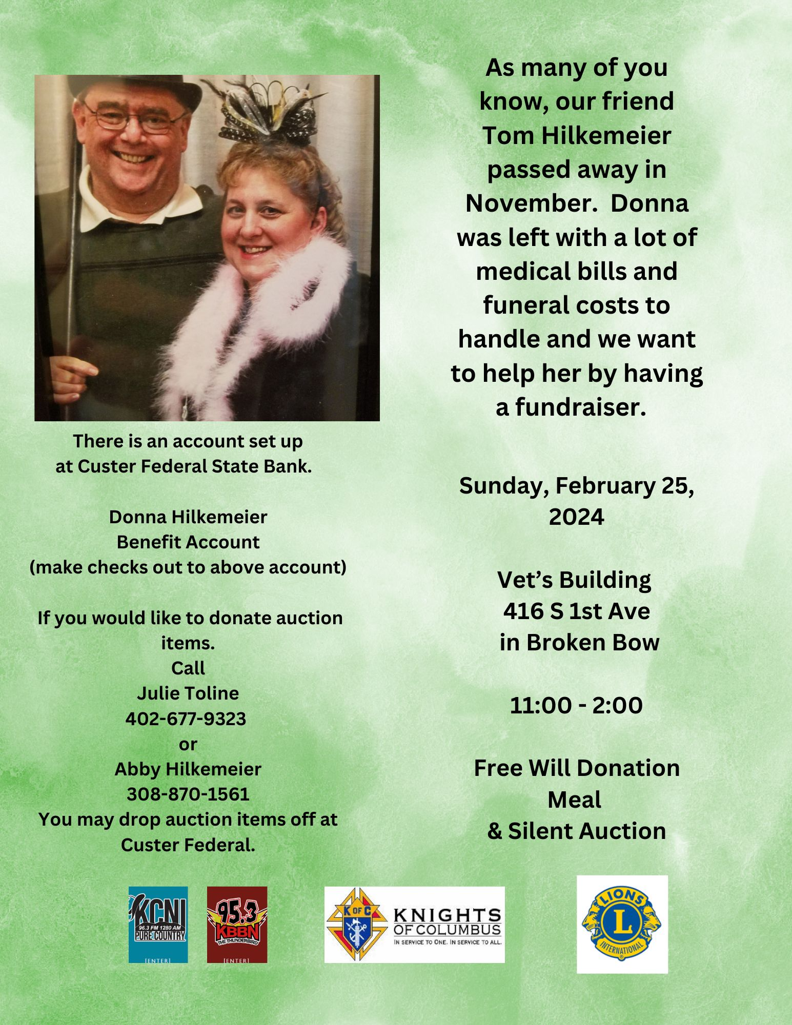 Donations for auction items are being accepted and you can drop off the auction item at Custer Federal or you can call Julie Toline at (402)-677-9323, or Abby Hilkemeier at (308)870-1561. If a preferred method of donation is monetary, there is an account set up at Custer Federal State Bank. If writing a check, the check needs to be made out to the “Donna Hilkemeier Benefit Account”.