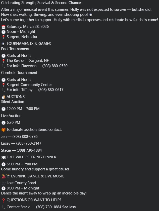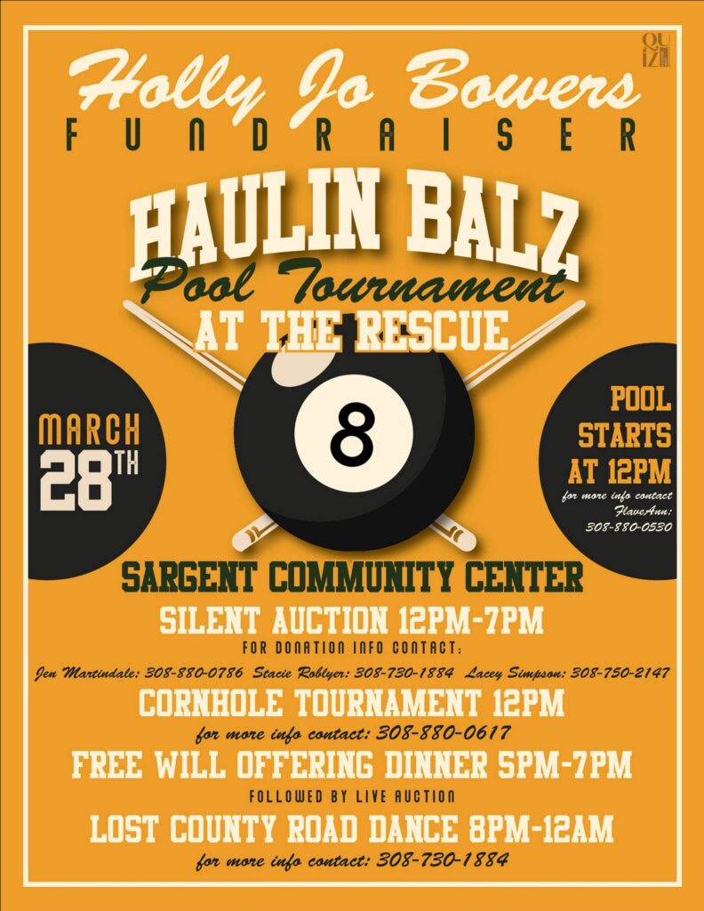Promoted with posters sporting pool balls and cues, a nod to Bowers’ skill around a pool table, the day starts at noon with a pool tournament at The Rescue Bar & Grill in Sargent. At the same time catty-corner across main street, a silent auction begins at noon at the Community Center with a cornhole tournament. A free will offering dinner is set for 5 PM ahead of a live auction and a dance with the band Lost County Road at 8 PM.