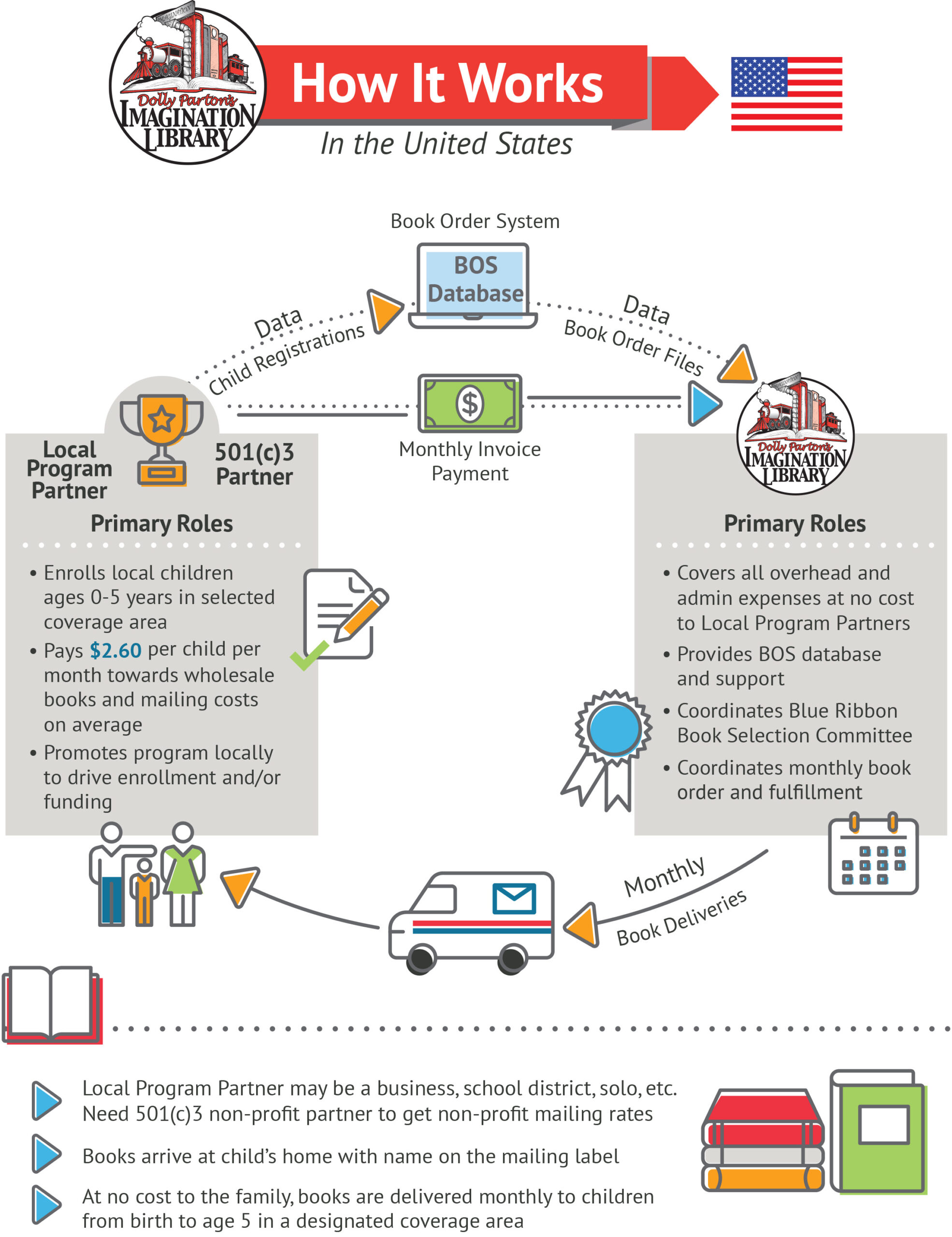 Local programs such as Rogers’ Nebraska Early Reading Development (NERD for short) group are in charge of enrolling children in their coverage area while also paying an average of $2.60 per child per month for wholesale books and mailing costs. Imagination Library covers all overhead and admin expenses at no cost to the local programs, while also coordinating book selection, book orders, and delivery.