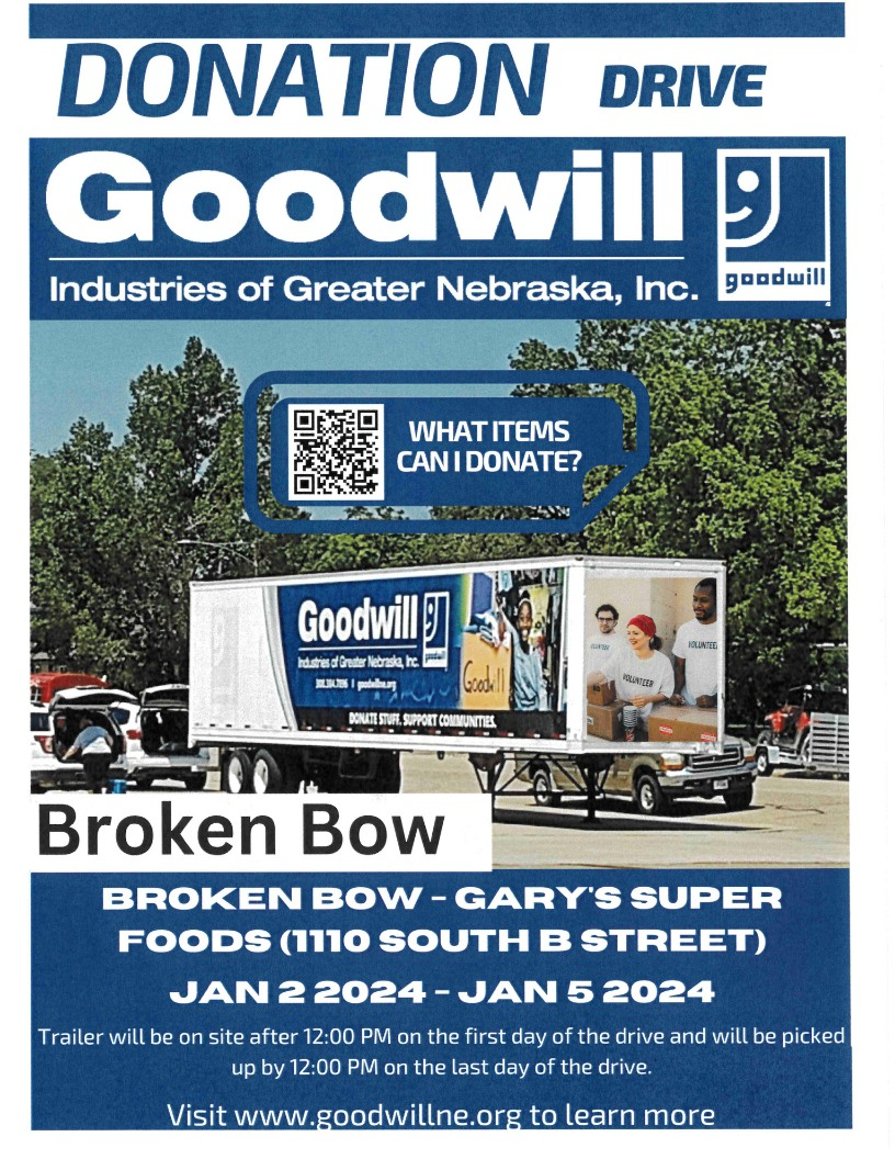 The Goodwill Donation trailer will be at Gary’s Super Foods in Broken Bow on January 2 from noon through January 5, unless the trailer is filled before January 5.