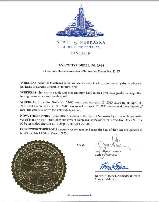 LINCOLN, NE – Governor Jim Pillen announced that the statewide burn ban will expire at 11:59 p.m. tonight, Thursday, April 20.