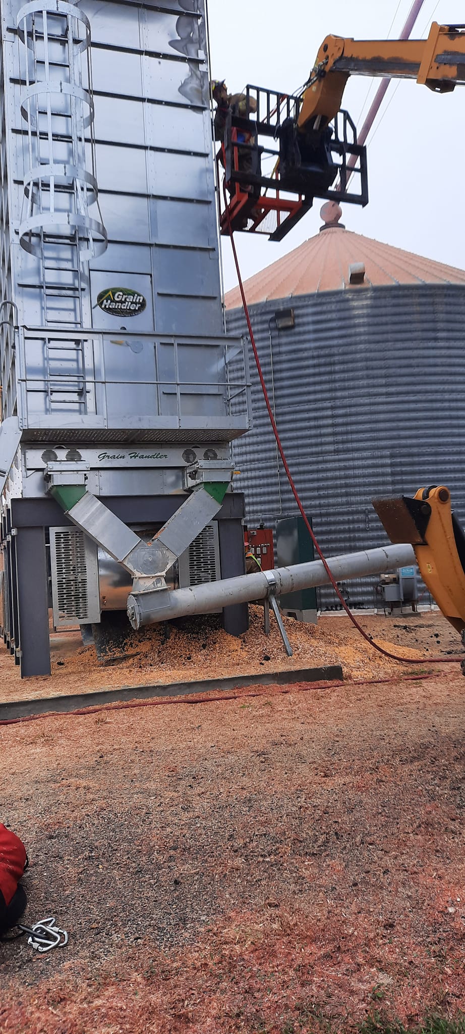 All of the corn was unloaded from the bin, the burnt corn was knocked out from the inside, and the grain bin was cleaned.