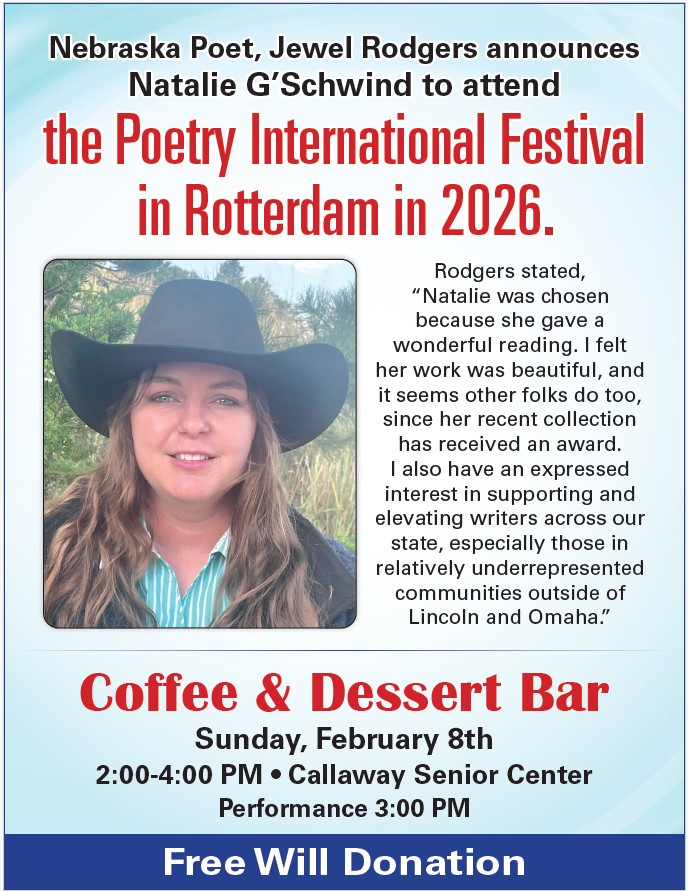 Callaway Cowboy Poet Natalie G’Schwind will be performing at a Coffee and Dessert Bar Fundraiser Sunday afternoon, February 8.