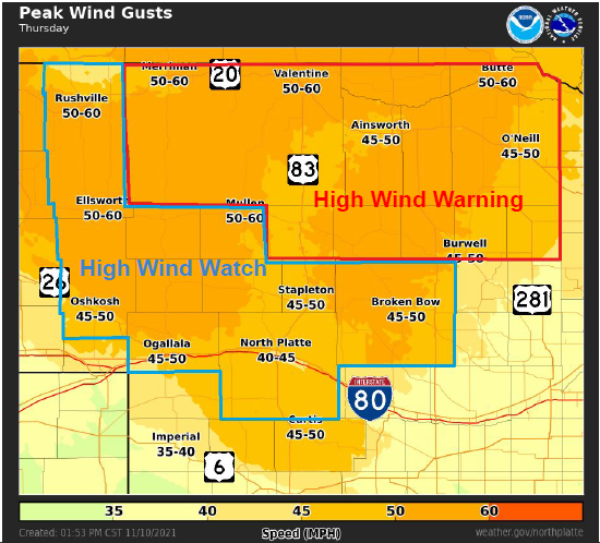 The National Weather Service in North Platte has issued high wind watches and warnings for a large portion of north-central Nebraska. A strong storm system will be crossing into the Great Plains today through Friday which will bring scattered rain showers and possible early Friday snow showers with little to no accumulation.