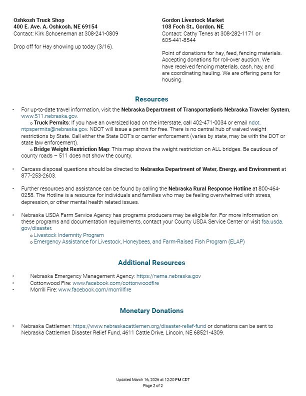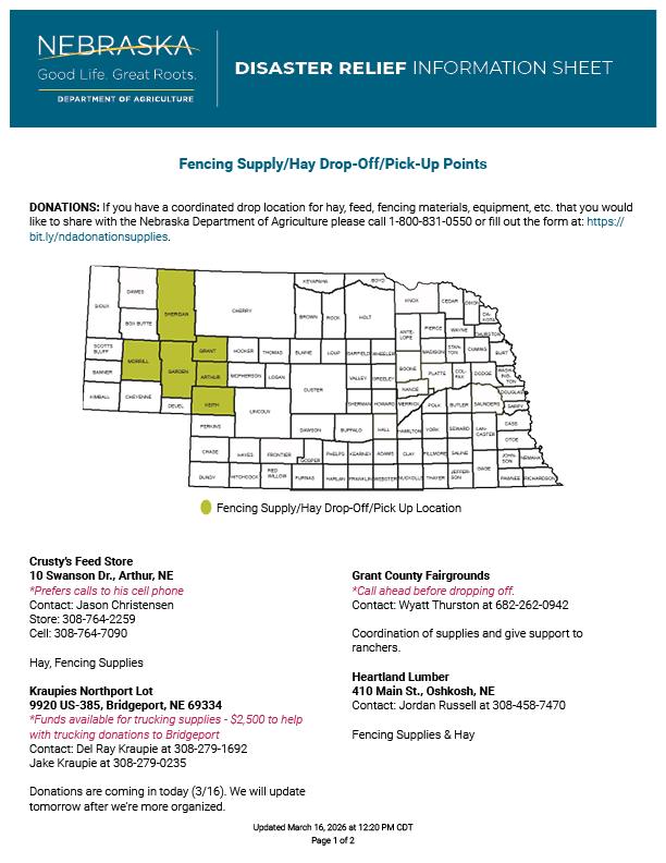 Fencing supply and hay drop-off and pick-up points established already include Crusty’s Feed Store in Arthur, Kraupies Northport Lot in Bridgeport, the Grant County Fairgrounds, Heartland Lumber in Oshkosh, Oshkosh Truck Stop, and Gordon Livestock Market in Gordon. (Contact information for those locations can be seen in the image in this story)