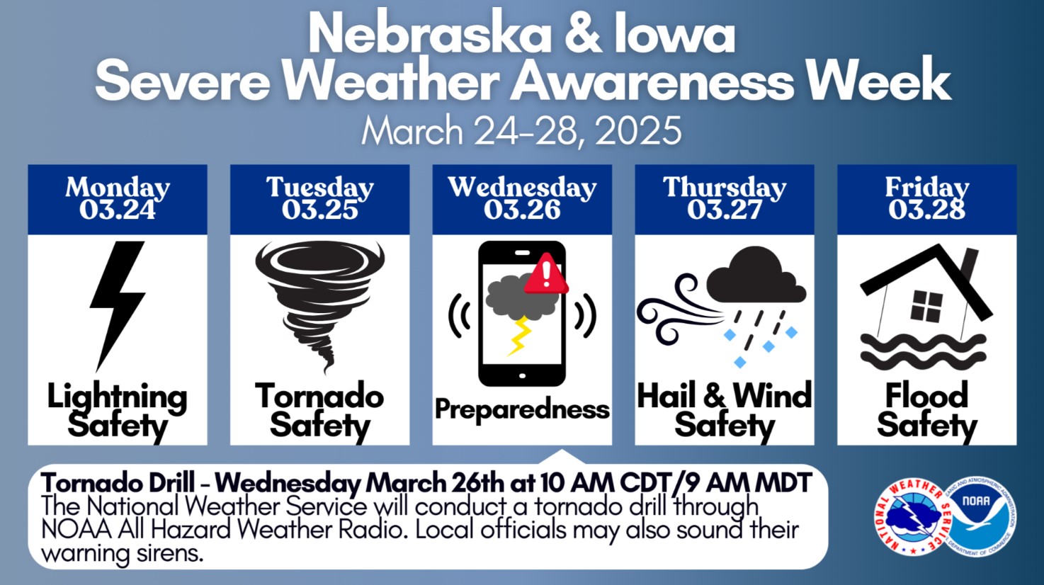 Severe weather awareness week runs from today (March 24) through Friday in both Nebraska and Iowa. The week serves as a reminder from the National Weather Service to prepare and review severe weather plans for your home or workplace.