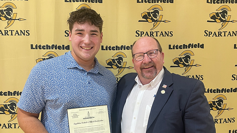 LITCHFIELD, Neb. – Litchfield Public Schools welcomed Senator Dan McKeon on Monday, May 5, as he presented junior James Fletcher with a legislative resolution recognizing his outstanding achievement. James was recently elected as the 2025–2026 Nebraska FBLA State Vice President. During the special presentation at the school, Senator McKeon commended James for his leadership and dedication to the Future Business Leaders of America (FBLA) organization.