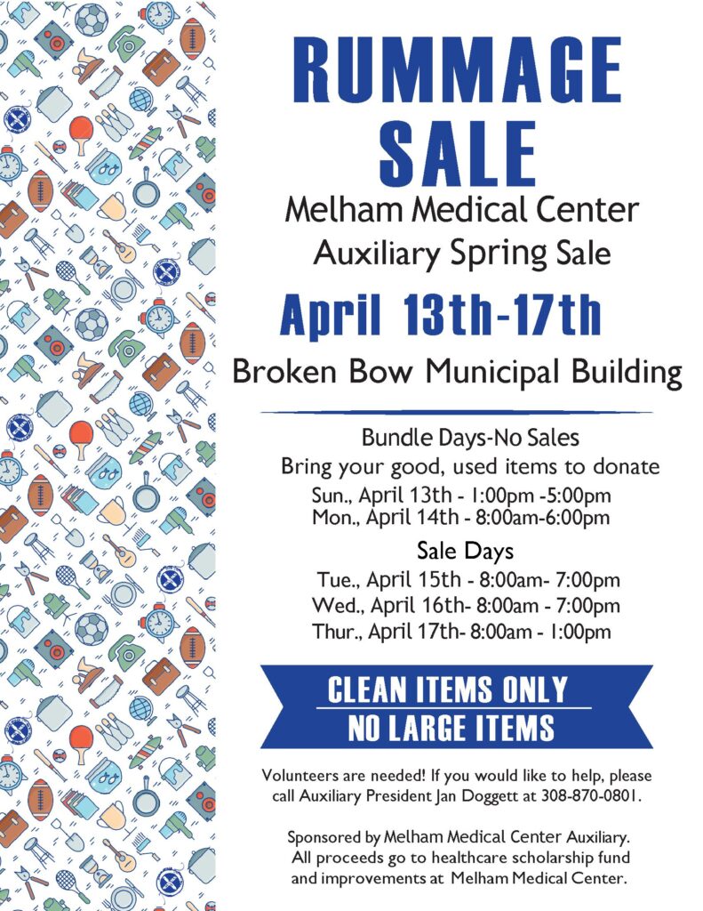The annual rummage sale to benefit the Jennie M. Melham Memorial Medical Center Auxiliary is scheduled for April 13th – 17th at the Broken Bow Municipal Building. The public is asked to donate items that are clean and in good condition for the sale. Items will be collected at the Municipal Building on Sunday (4/13) from 1-5 and on Monday (4/14) from 8-6. Auxiliary President Jan Doggett was a guest on KCNI’s Public Affairs and shared the need for volunteers to assist with this year’s sale.