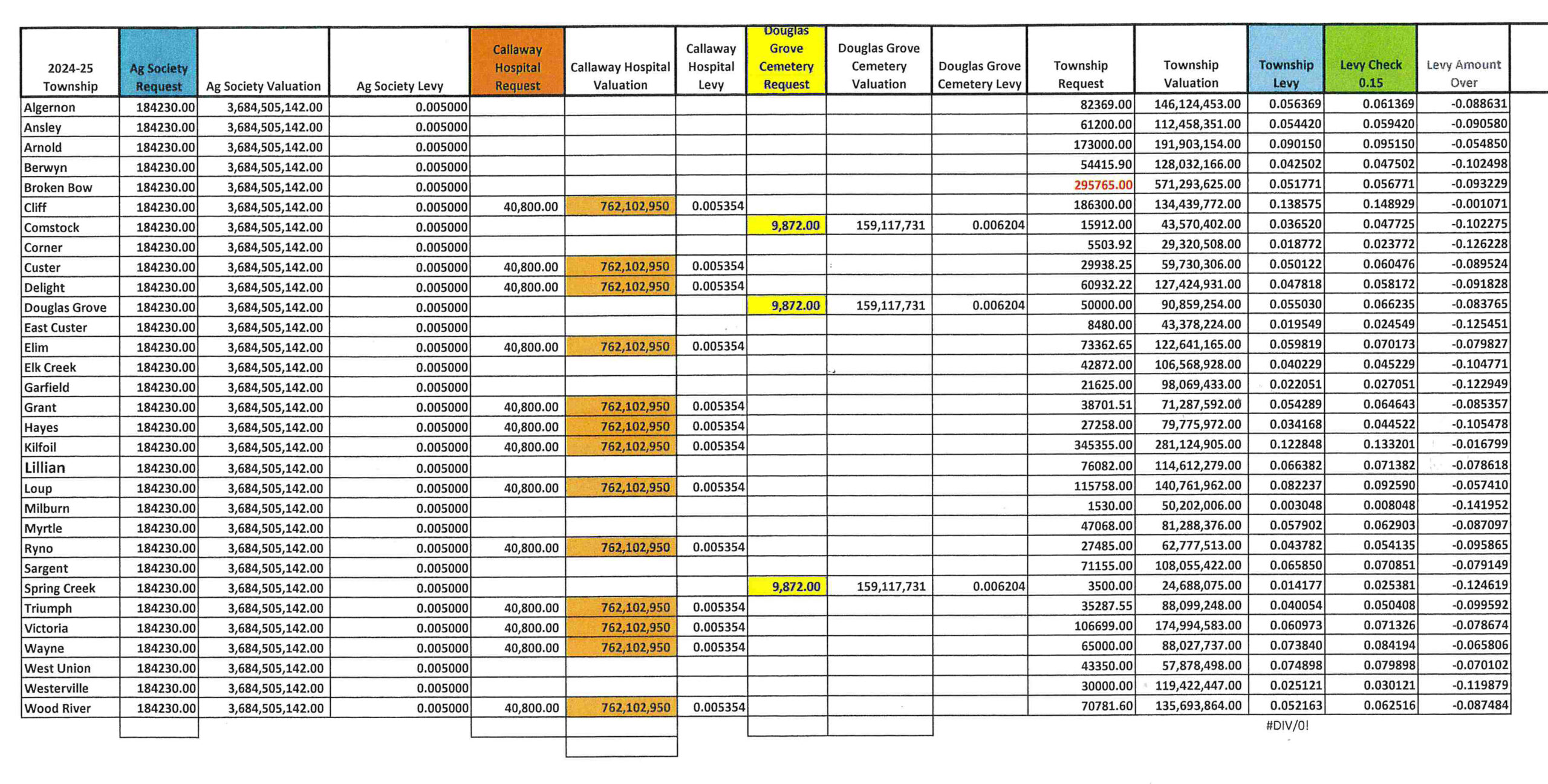 In Board of Equalization business, the board approved the levy allocation requests for all subdivisions for the upcoming fiscal year, pending only decisions later in the day’s business regarding the Corner Township. District 1 supervisor Anne Gibbons was the lone “no” vote, citing the desire for separate motions, more time to discuss, and that the budget is still pending. In addition to the townships themselves requests included, from the Custer County Ag Society: $184,230, from the Callaway Hospital: $40,800, and from the Douglas Grove Cemetery: $9,872.