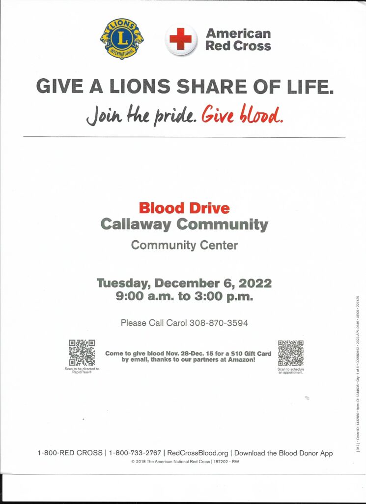 CALLAWAY – The Lions Club is once again looking out for Custer County, this time with another blood drive.