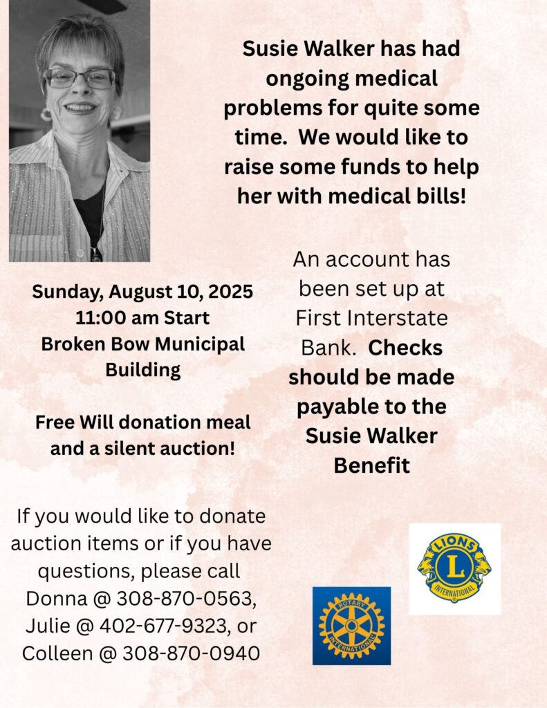 The Broken Bow Lions Club, in partnership with the Broken Bow Rotary, is inviting the community to come together this weekend to support Susie Walker beginning at 11 AM at the Broken Bow Municipal Building.