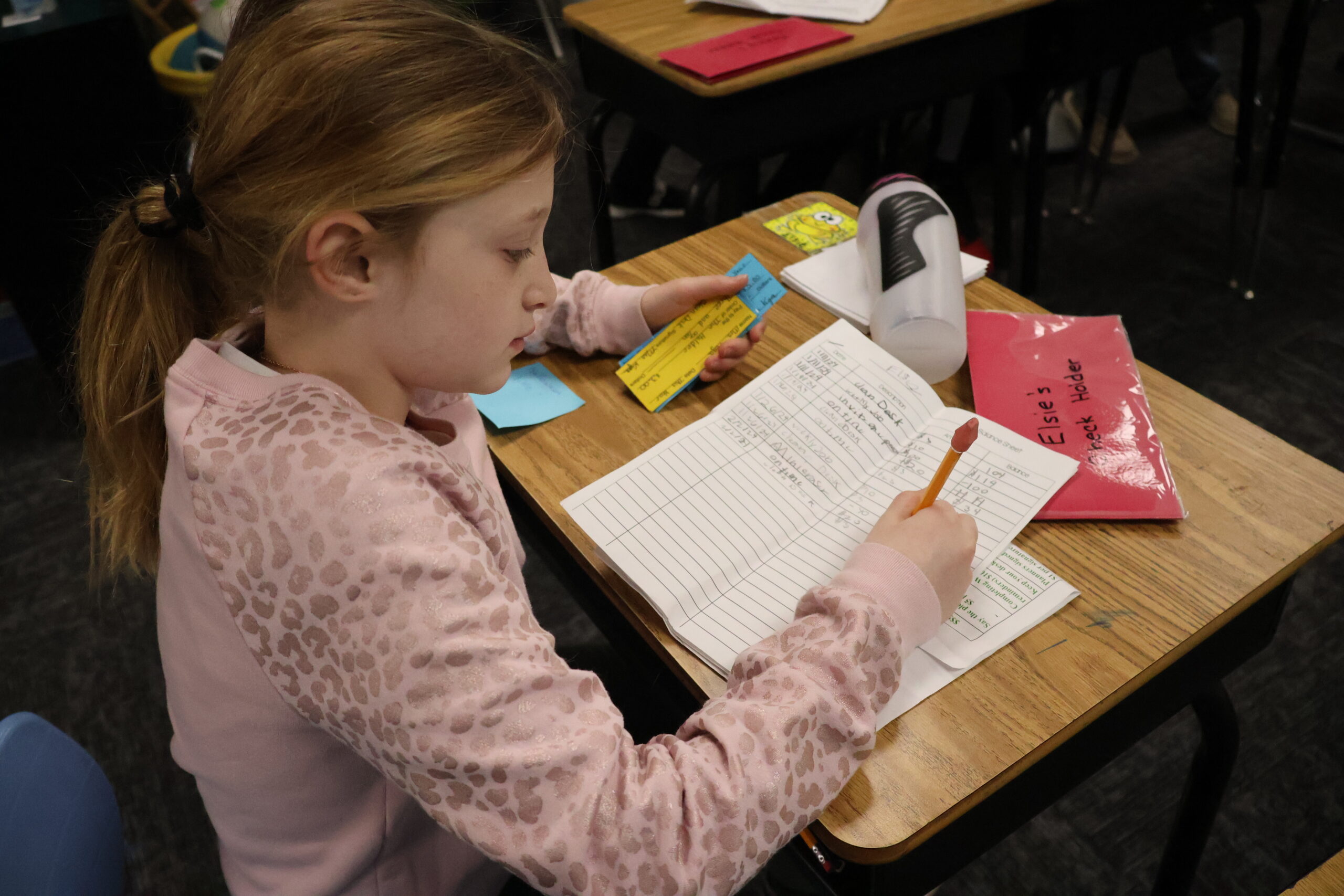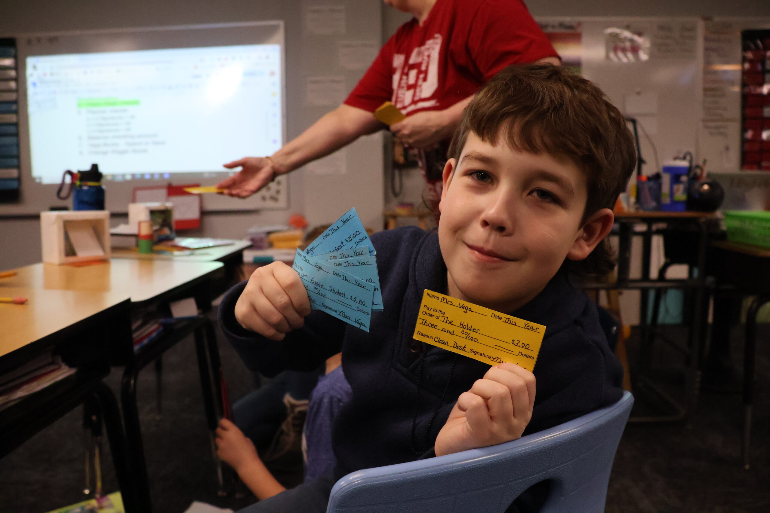 Every Friday, Mrs. Vega’s class has “house-keeping”. The students organize and clean their desks. While they complete it, Mrs. Vega walks around with Vega Bucks, $3 checks for completing the task. After their desk is clean, they add all of their checks from the week and balance their account. Then, the store opens for business, Mrs. Vega double checks their math, and students choose to save or spend.