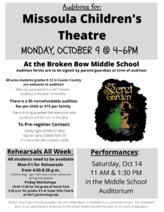 The Broken Bow Middle/High School cafeteria will be home for Missoula Children’s Theatre auditions of The Secret Garden on Monday, October 9 from 4:00-6:00 pm.
