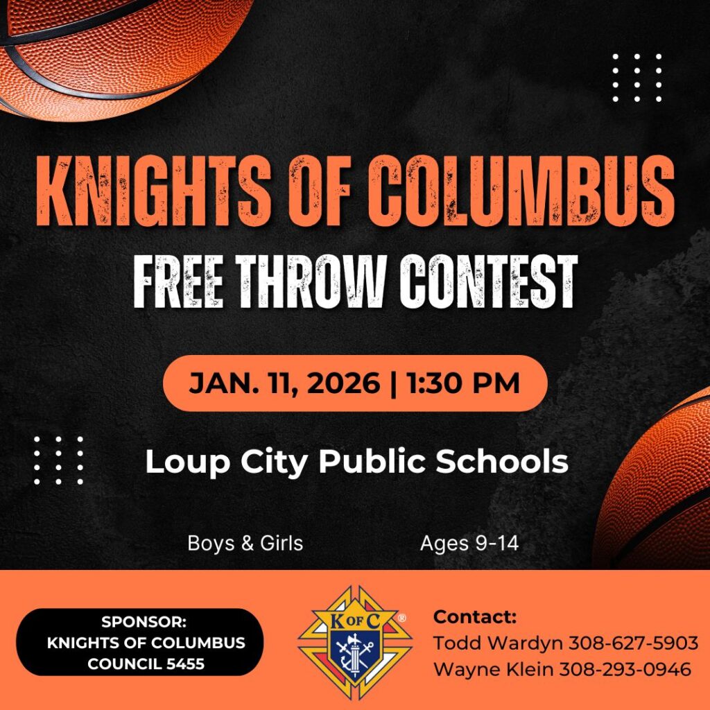 The Loup City Free Throw Contest sponsored by the Knights of Columbus takes place Sunday, January 11 at 1:30 PM at the Loup City Public Schools. Boys and girls will compete in their age groups in a fun and friendly afternoon of competition and show off their free-throw skills