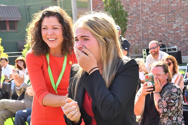 (R-L) Loup County English Teacher Megan Helberg and Loup County Junior Gracie Conrad after learning she is the winner of the Lowell Milken Center for Unsung Heroes (LMC) 2022 international Discovery Award competition. Photo: Milken Family Foundation/Keylight Communications.